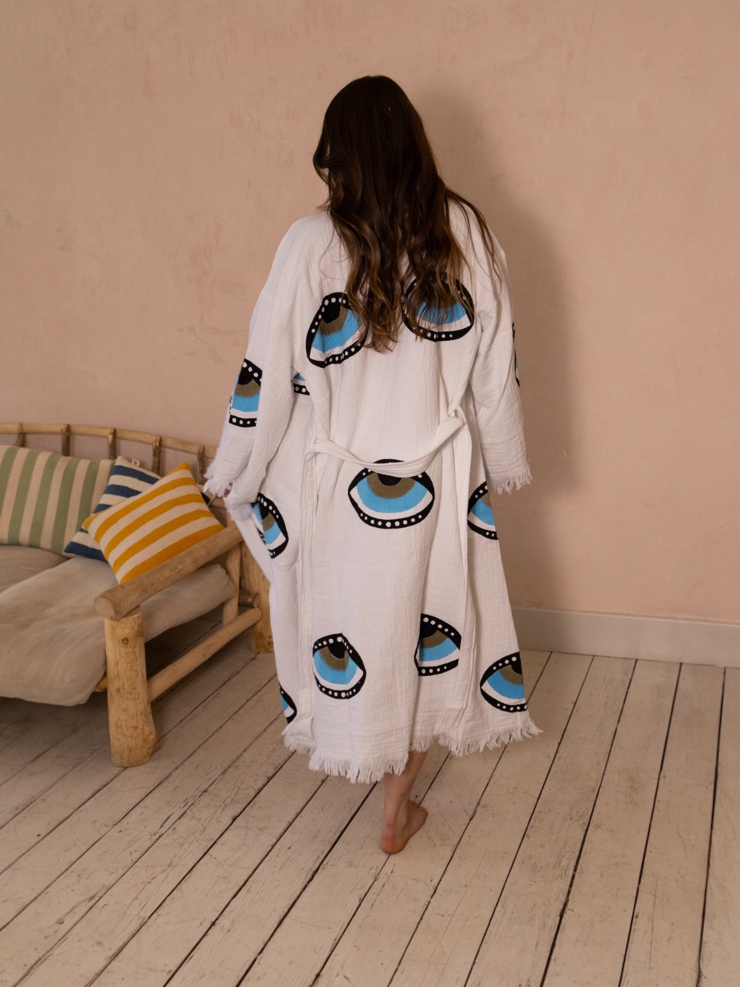 The Athena White robe is a fresh take on a Ruya favourite — striking in crisp white with a bold evil eye print that speaks of strength, spirit, and protection. Lightweight and breathable, it’s made from 100% cotton for a soft, effortless drape you’ll want to live in.