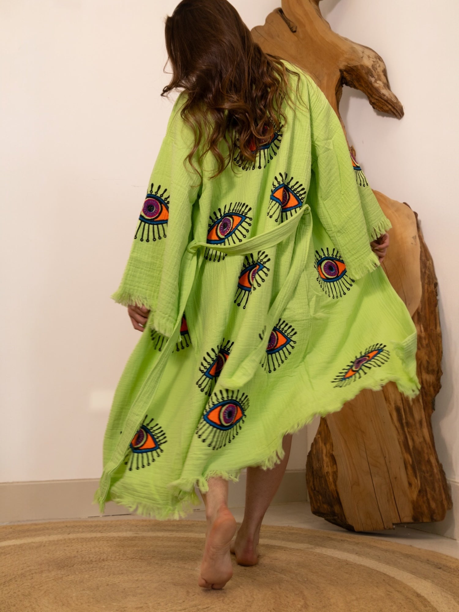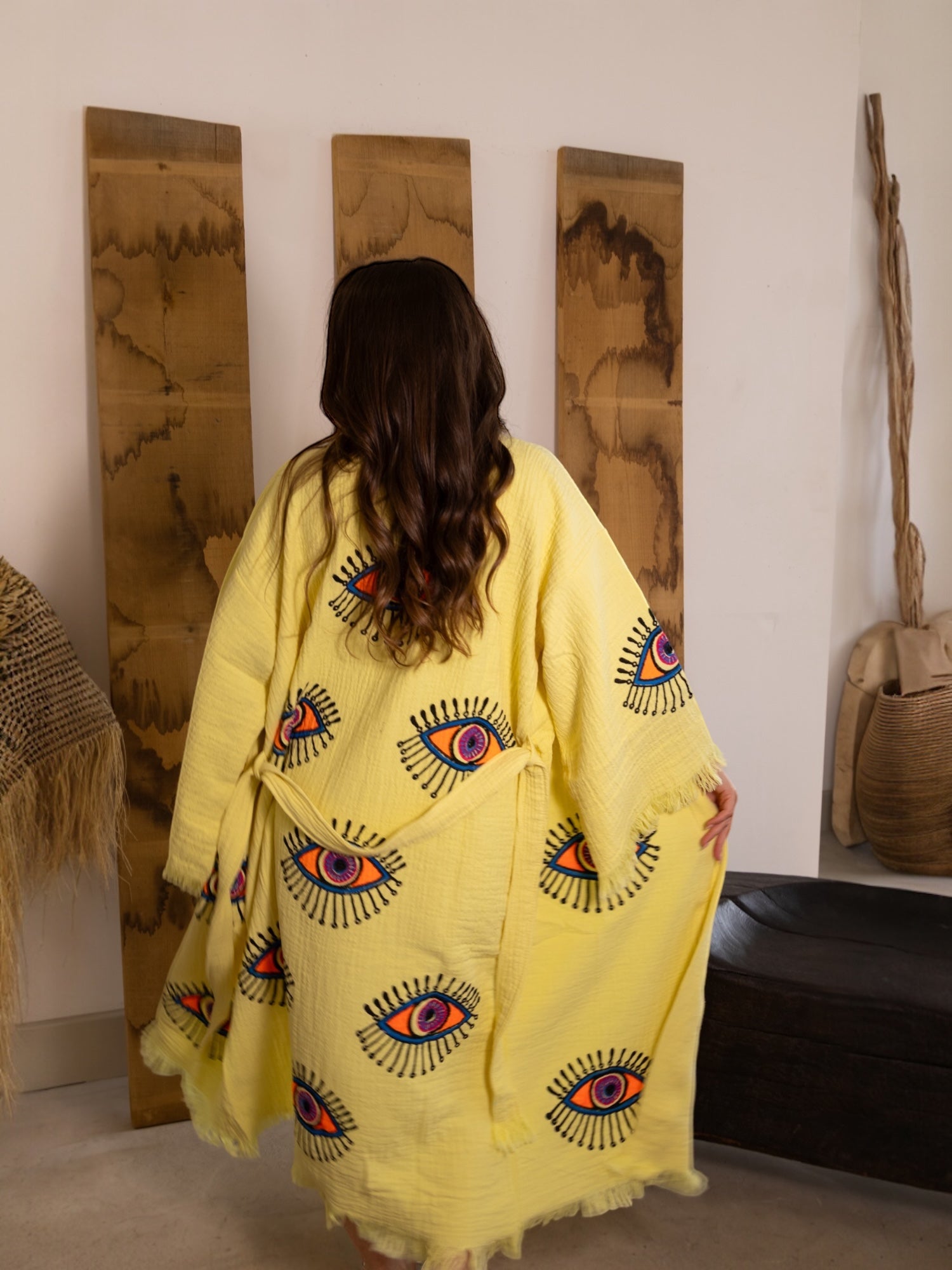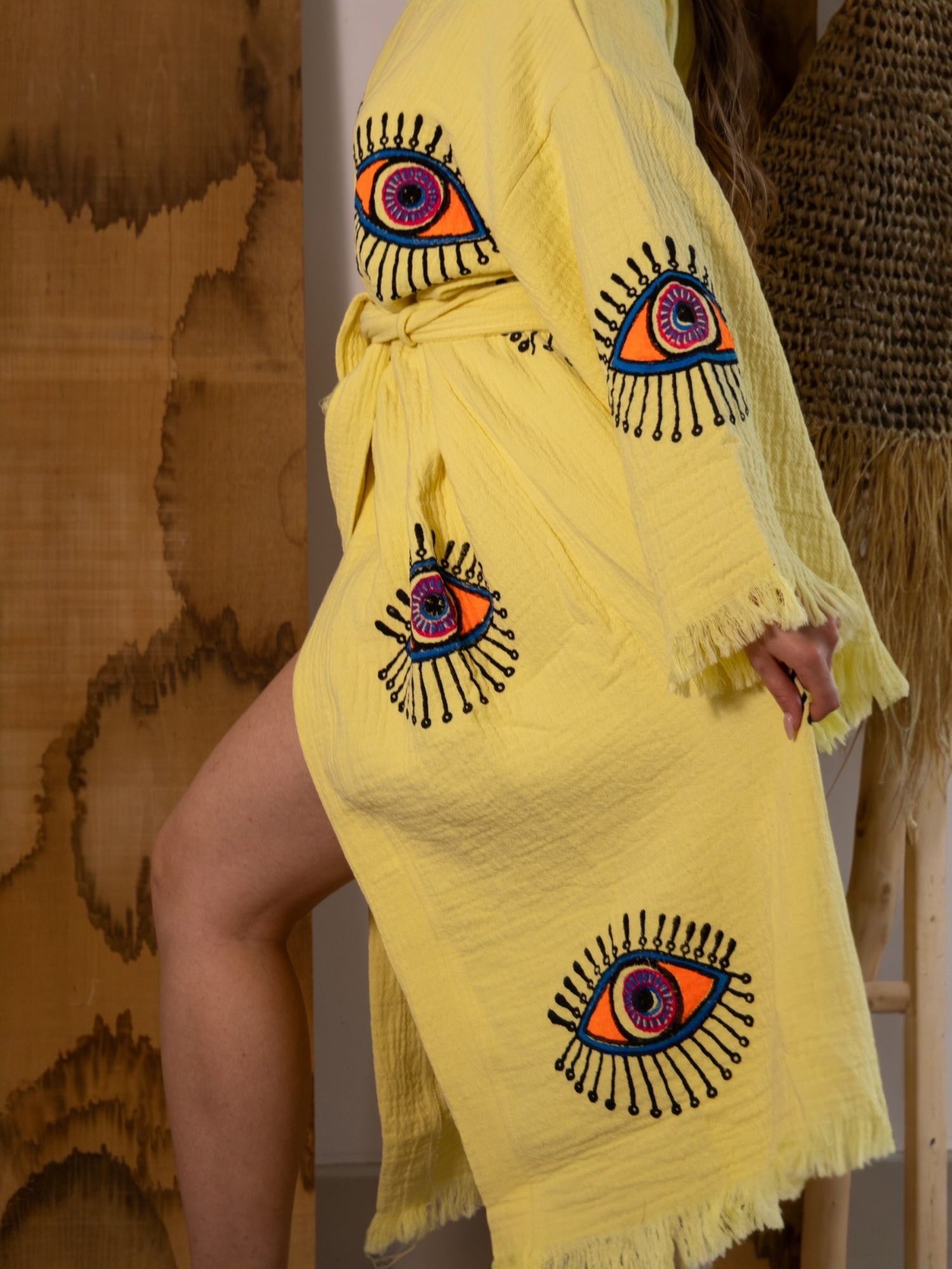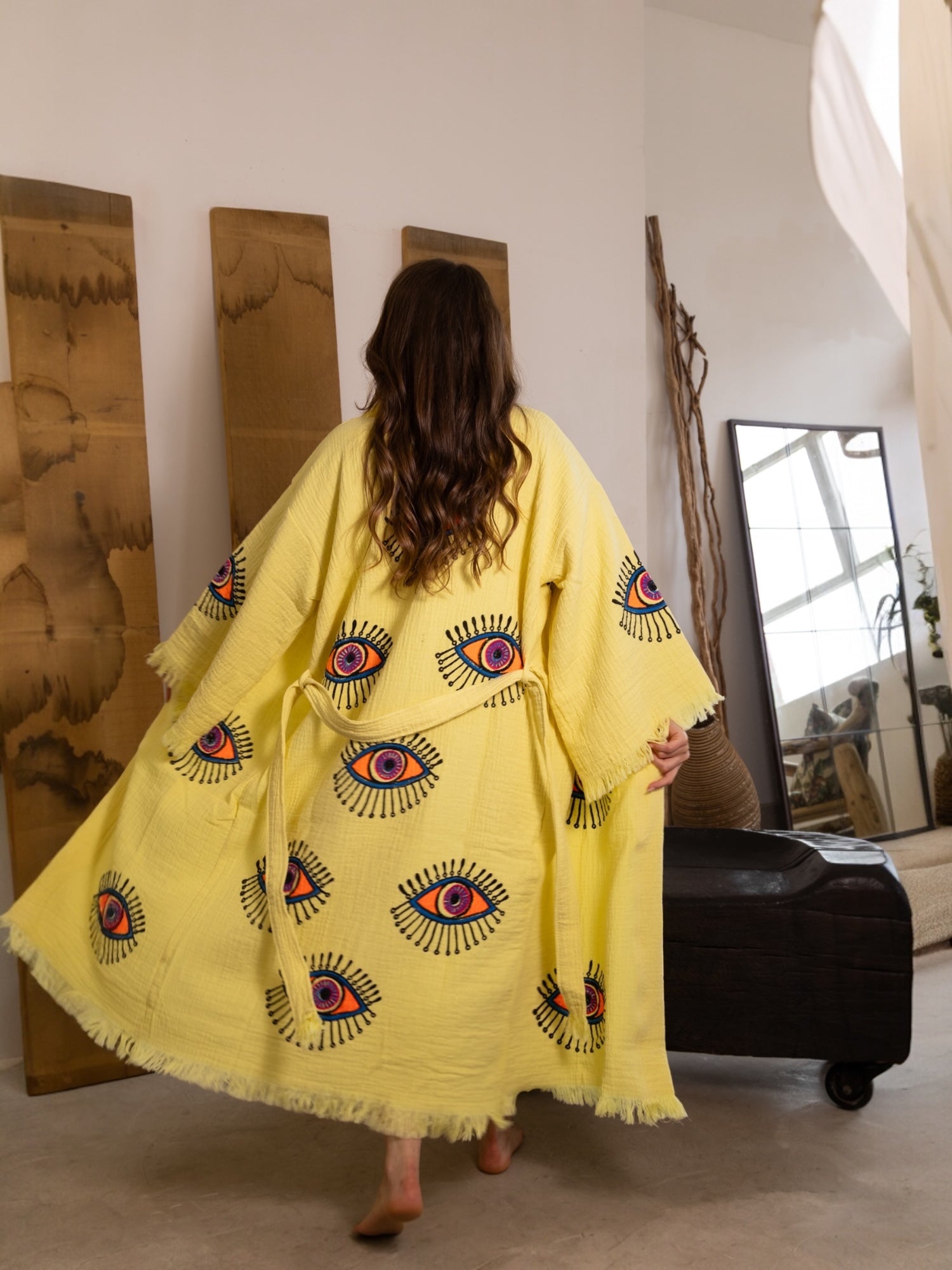 Part of our dream-drenched Ruya Collection, the Zoya robe brings bold energy and effortless charm. With its vibrant evil eye design and eye-catching colour palette, Zoya is a statement piece with a story — a symbol of protection wrapped in soft, breathable cotton.
