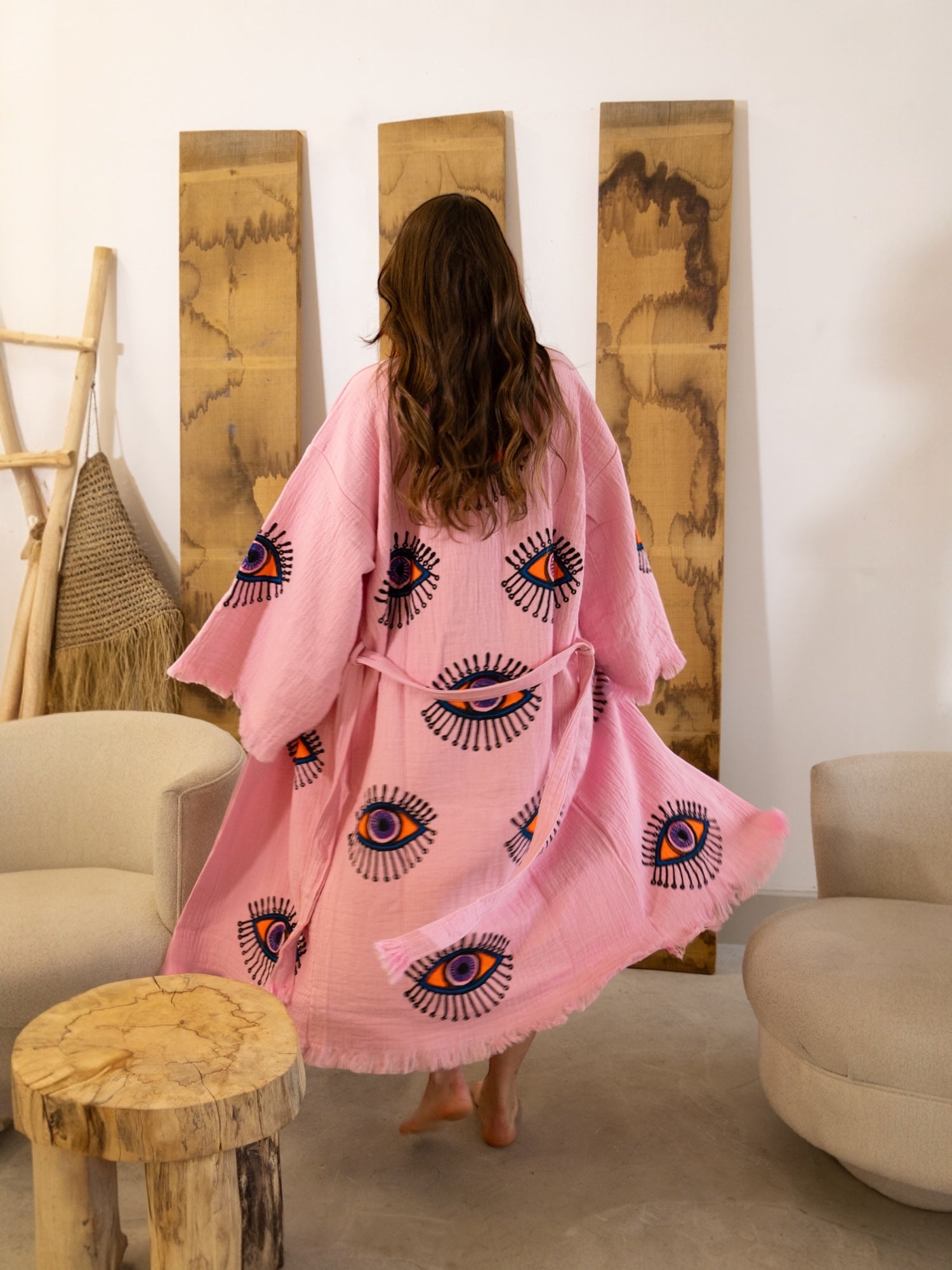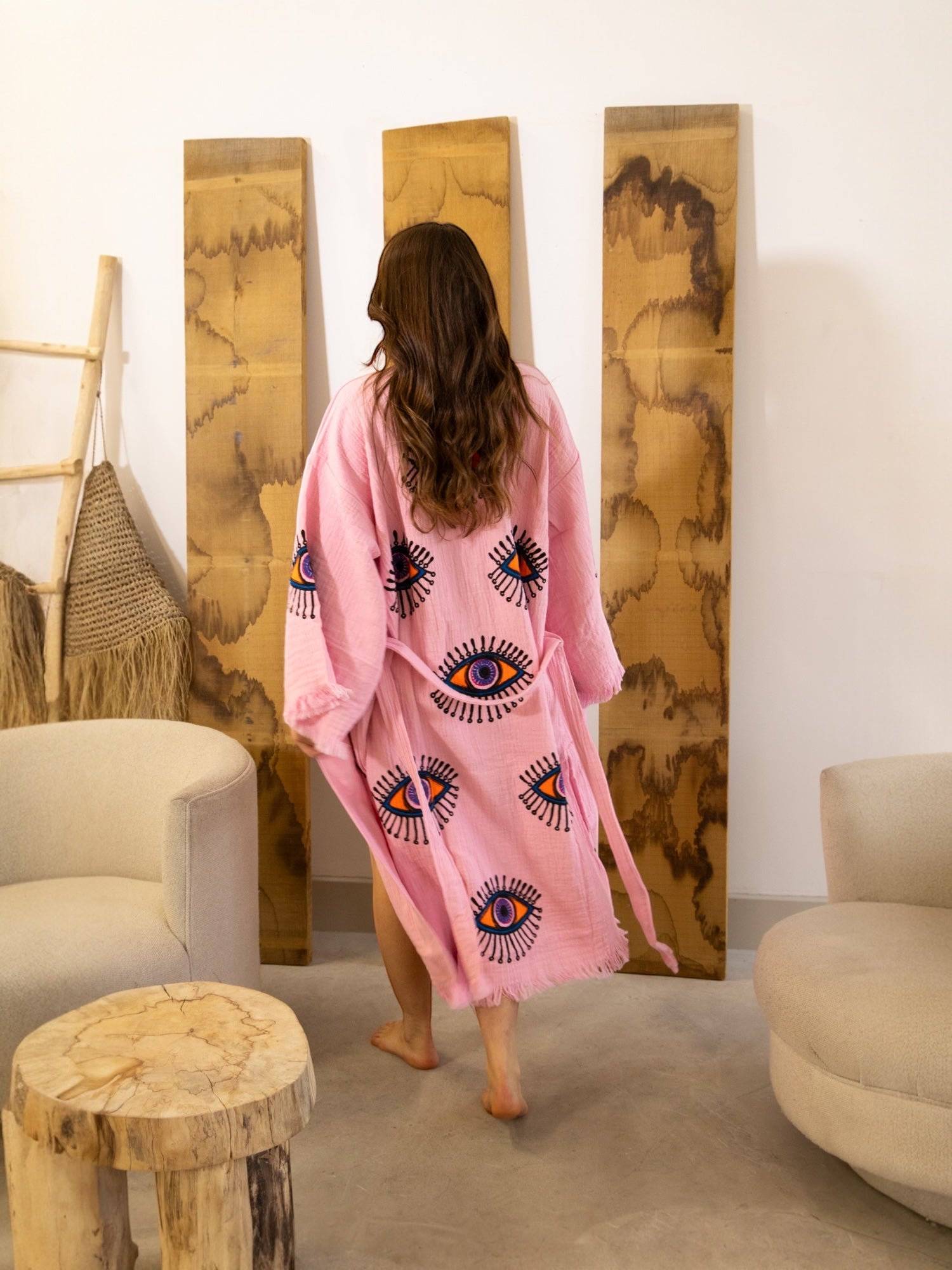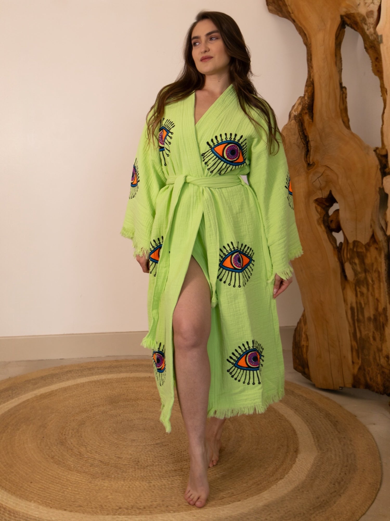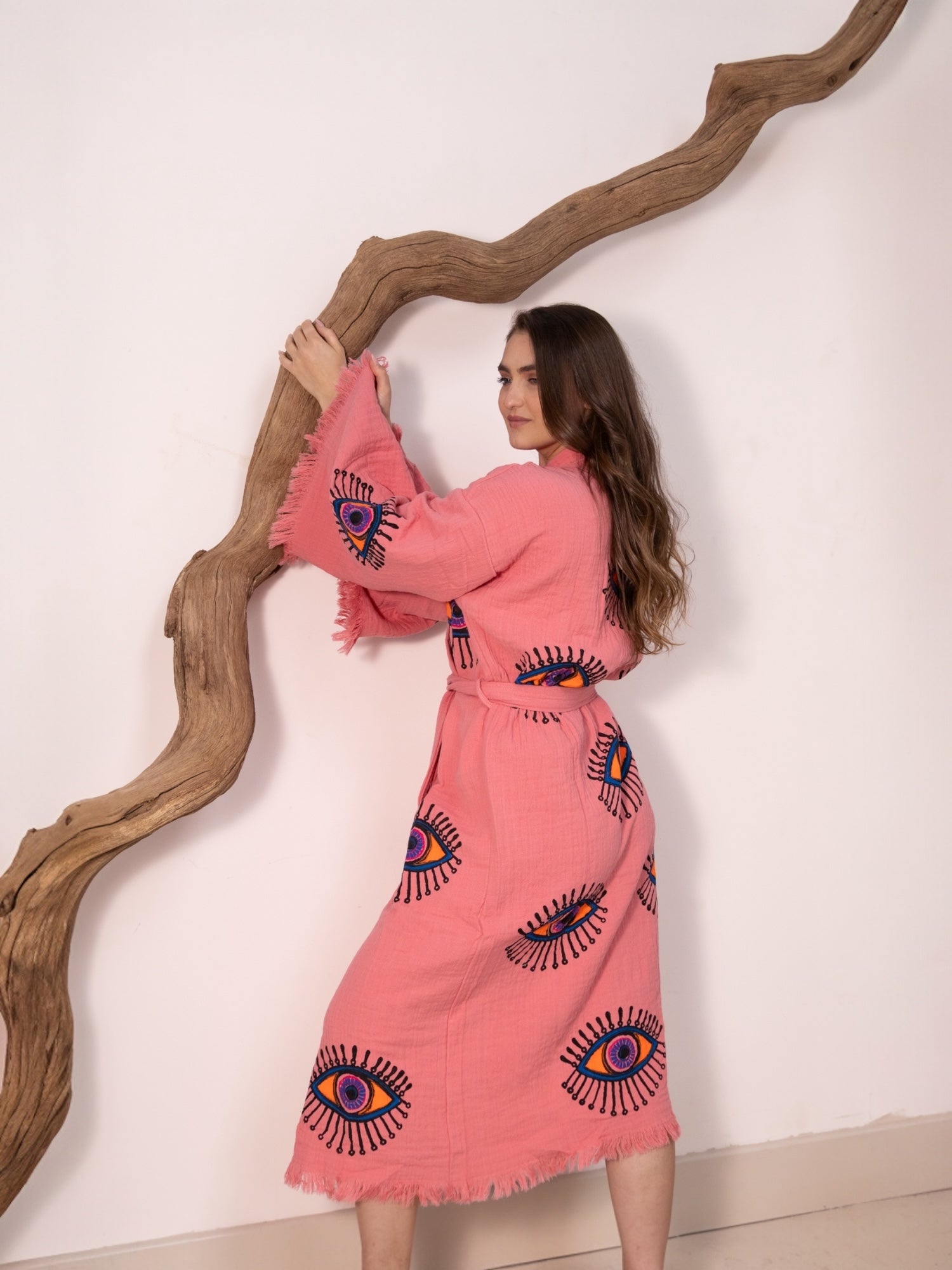 Part of our dream-drenched Ruya Collection, the Zoya robe brings bold energy and effortless charm. With its vibrant evil eye design and eye-catching colour palette, Zoya is a statement piece with a story — a symbol of protection wrapped in soft, breathable cotton.